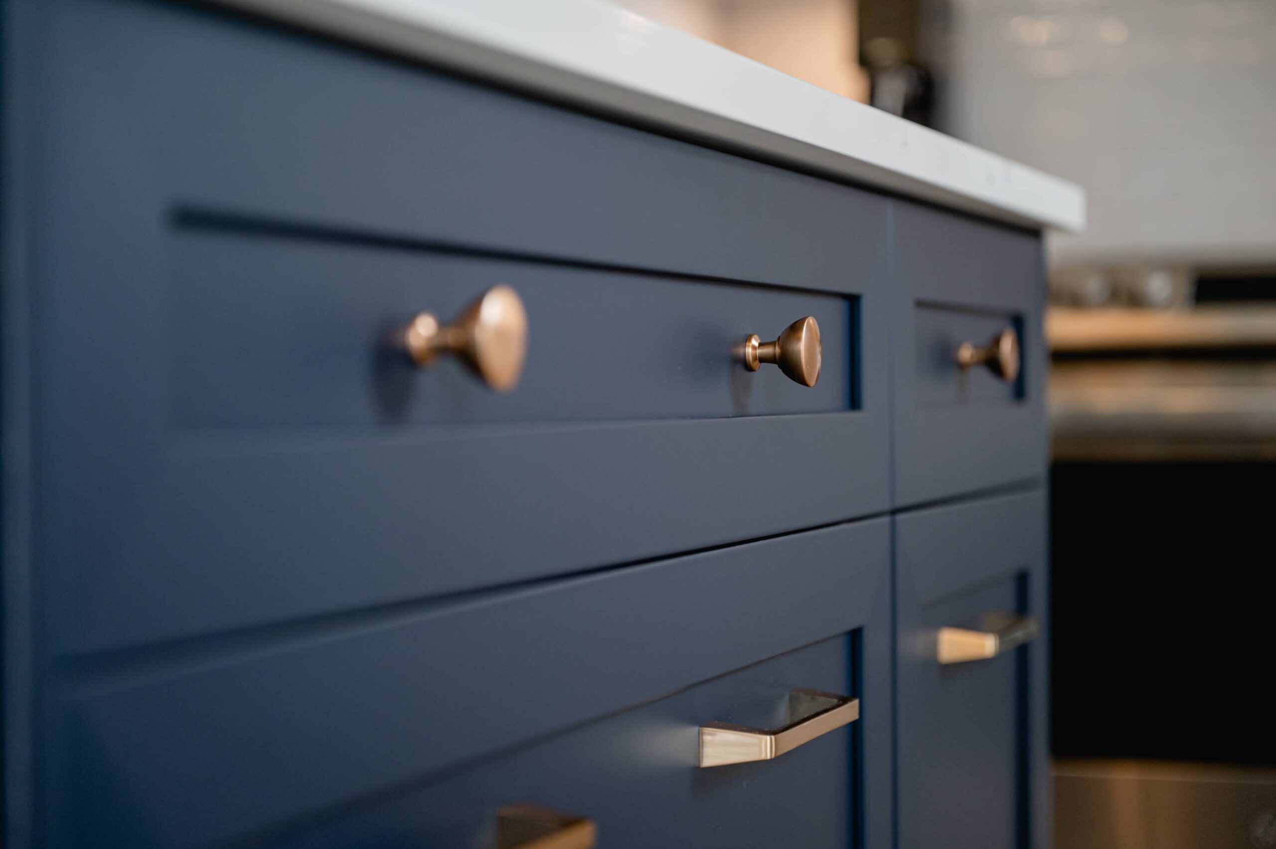 Chaque poignée et bouton a été soigneusement choisi pour créer un contraste élégant avec le bleu mat des façades. L’assemblage minutieux des panneaux et la finesse du grain révèlent un savoir-faire maîtrisé. Une finition haut de gamme, pensée pour durer et plaire longtemps.