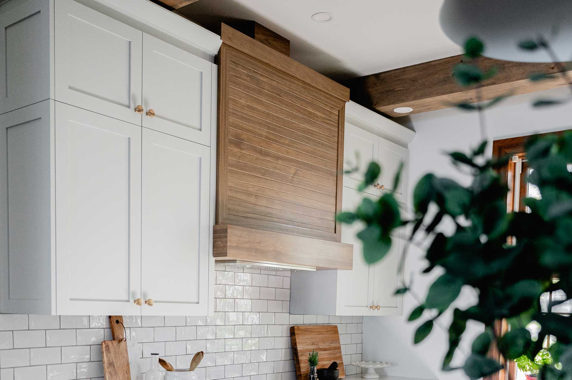 Cette hotte sur mesure en bois massif, intégrée à des armoires blanches à cadre shaker, s’impose comme une pièce maîtresse chaleureuse au cœur de l’espace. Le jeu de textures entre les surfaces lisses et le relief des lattes verticales renforce le cachet artisanal de l’ensemble, tandis que les poutres apparentes complètent harmonieusement l’ambiance.