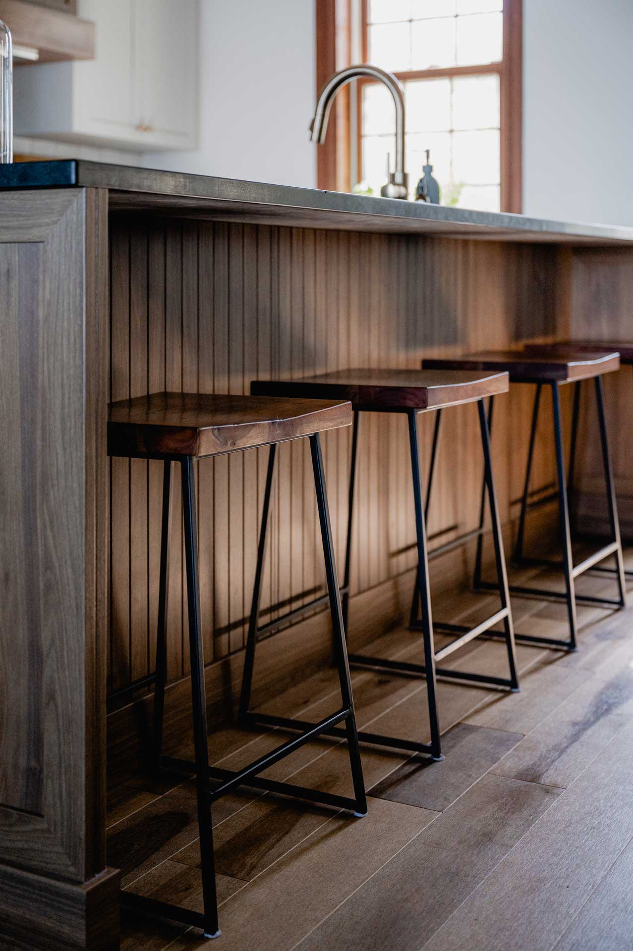 Avec son placage de bois travaillé en lambris vertical, cet îlot devient une pièce maîtresse à la fois fonctionnelle et élégante. Conçu sur mesure, il marie le style rustique chic à un savoir-faire d’ébénisterie précis, pour un résultat qui ancre la pièce dans l’authenticité et le confort.