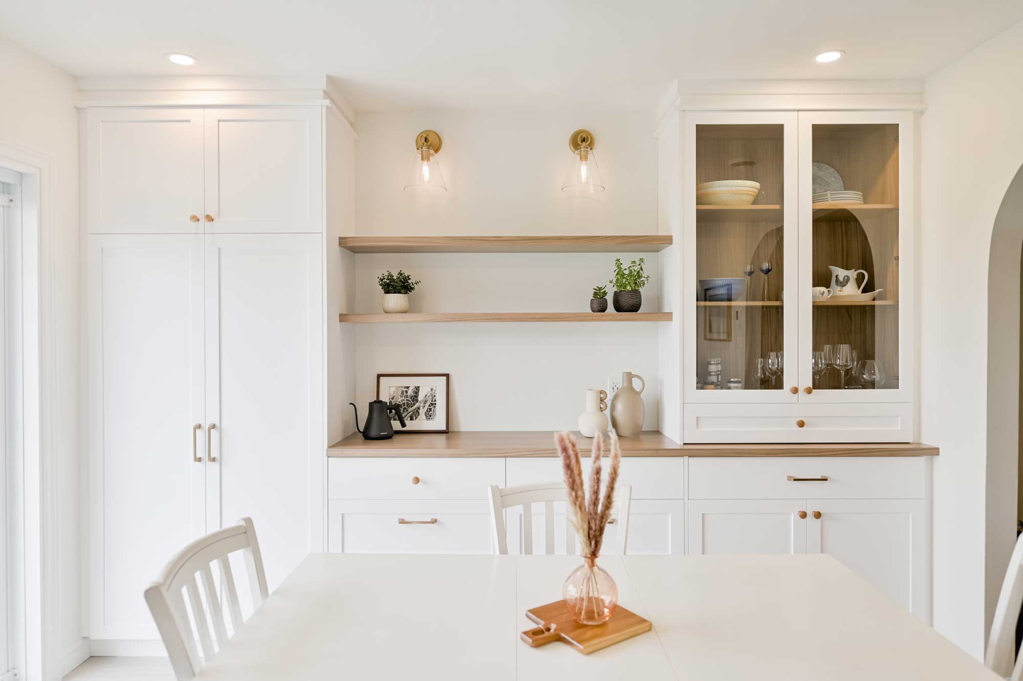 Ce coin repas chaleureux met en valeur un meuble vitré et des étagères en bois clair parfaitement intégrés. L’aménagement a été pensé pour offrir à la fois du rangement pratique et une esthétique épurée, tout en laissant circuler la lumière. Le mariage du blanc et du bois naturel crée une ambiance douce et accueillante.