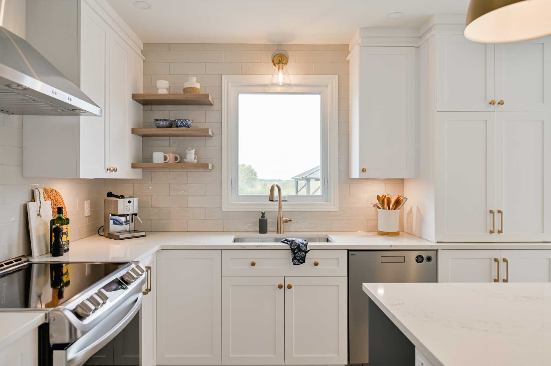 Cette cuisine tout en blanc séduit par sa simplicité élégante et son aménagement bien pensé. Les armoires sur mesure offrent un rangement optimal, tandis que les étagères flottantes en bois ajoutent une touche chaleureuse et actuelle. Un bel équilibre entre fonctionnalité, clarté et style.