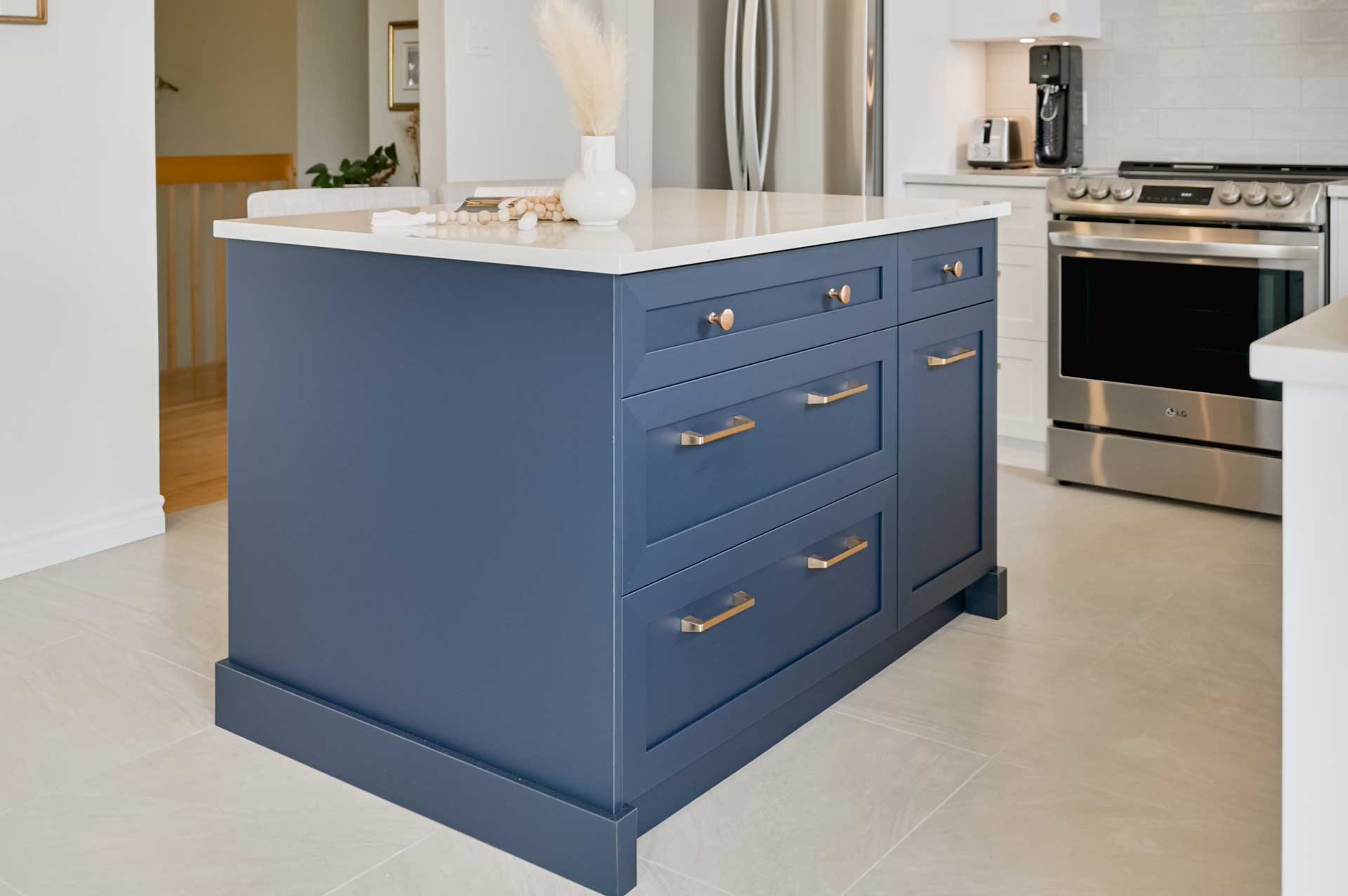 Avec sa teinte bleu profond et son fini mat, cet îlot central s’impose comme une pièce maîtresse aussi esthétique que pratique. Il propose un généreux espace de rangement, complété par une quincaillerie dorée qui rehausse l’ensemble avec une touche chic et chaleureuse. Un parfait équilibre entre fonctionnalité et caractère.
