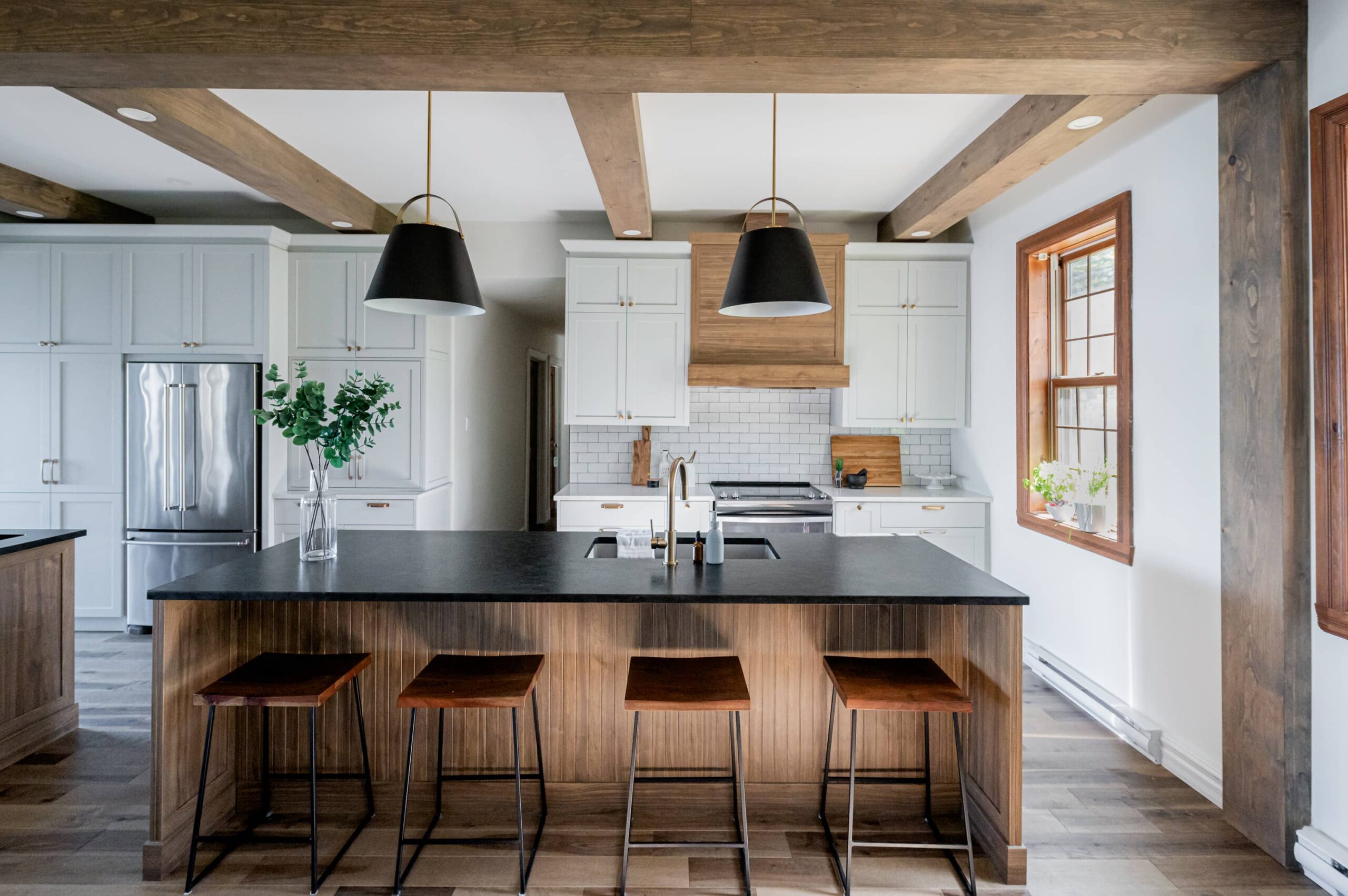 Cette hotte sur mesure en bois massif, intégrée à des armoires blanches à cadre shaker, s’impose comme une pièce maîtresse chaleureuse au cœur de l’espace. Le jeu de textures entre les surfaces lisses et le relief des lattes verticales renforce le cachet artisanal de l’ensemble, tandis que les poutres apparentes complètent harmonieusement l’ambiance.