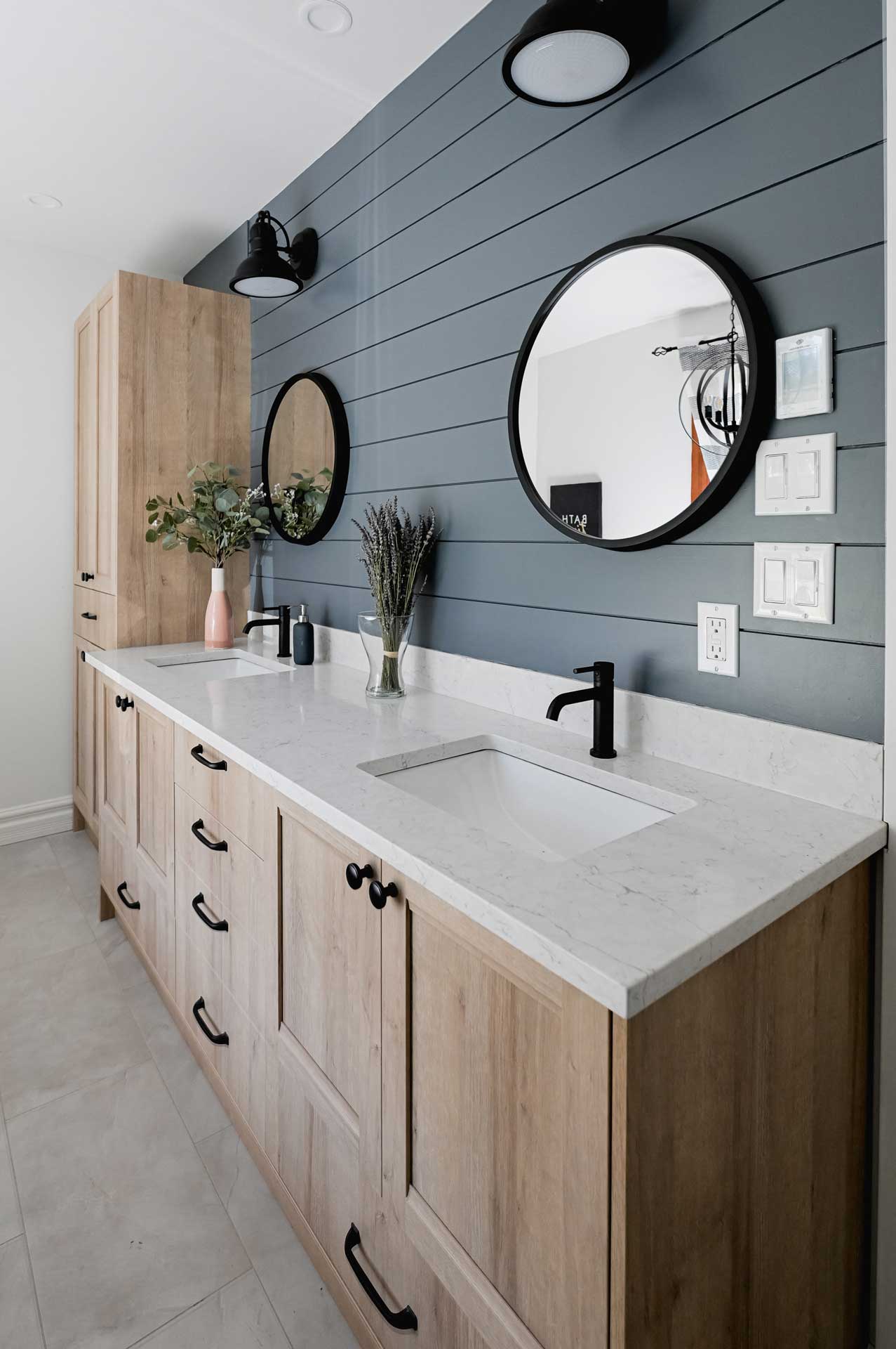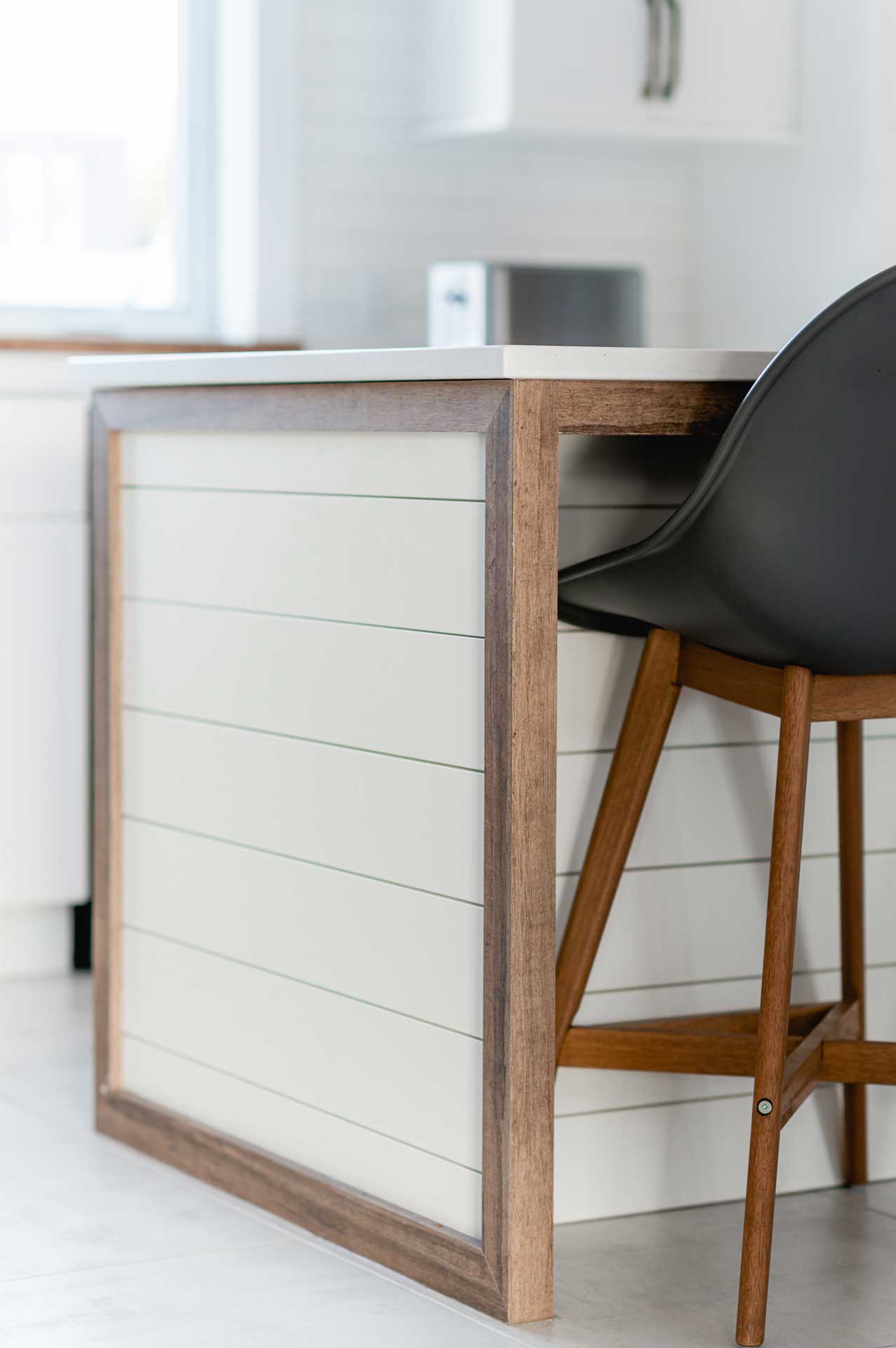 Avec son placage de bois travaillé en lambris vertical, cet îlot devient une pièce maîtresse à la fois fonctionnelle et élégante. Conçu sur mesure, il marie le style rustique chic à un savoir-faire d’ébénisterie précis, pour un résultat qui ancre la pièce dans l’authenticité et le confort.