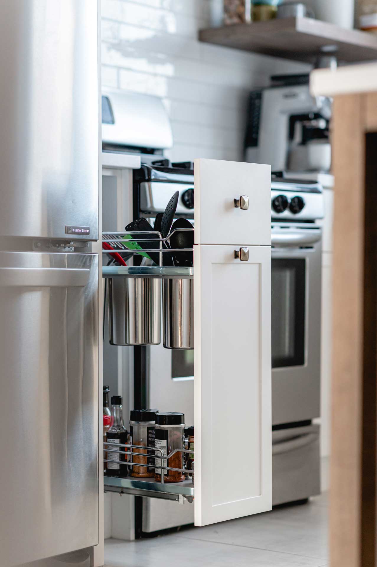 Chaque centimètre compte quand on conçoit du mobilier sur mesure. Ce module coulissant, installé à proximité de la cuisinière, permet un accès direct aux huiles, vinaigres et ustensiles de cuisson. Un exemple parfait d’une conception axée sur la fluidité des gestes au quotidien. Parce que l’intelligence d’un aménagement, ça se vit dans les petits détails.
