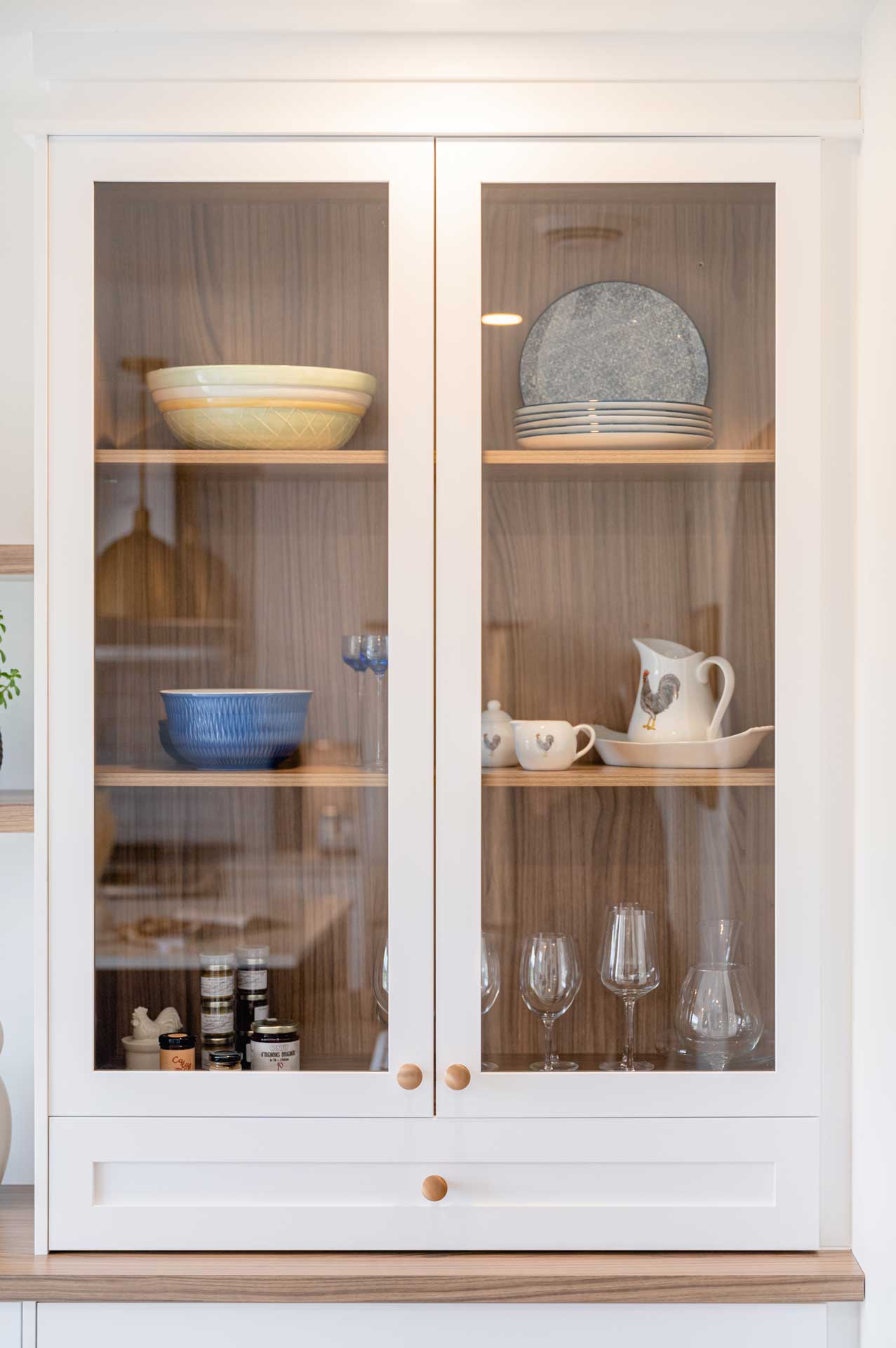 Ce coin repas chaleureux met en valeur un meuble vitré et des étagères en bois clair parfaitement intégrés. L’aménagement a été pensé pour offrir à la fois du rangement pratique et une esthétique épurée, tout en laissant circuler la lumière. Le mariage du blanc et du bois naturel crée une ambiance douce et accueillante.
